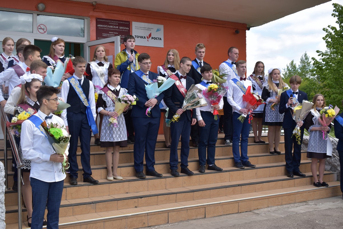 25 мая в Милославской школе для 26 одиннадцатиклассников прозвенел последний звонок. На торжественной линейке присутствовали почетные гости: заместитель министра имущественных и земельных отношений Рязанской области Елена Анурьева, глава администрации Милославского района Михаил Ромодин, начальник управления образования Милославского района Наталья Зенкина, председатель управляющего совета Милославской школы Наталья Саюкова. По традиции в начале праздника гости поздравляли и давали напутствия выпускникам.