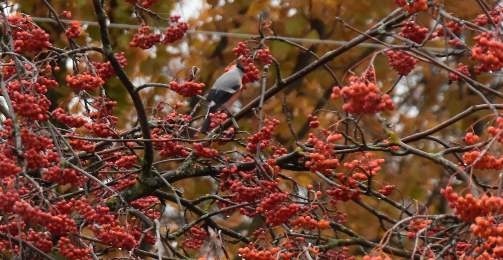 28 октября на улице Центральной в Милославском прохожие заметили снегирей. Красногрудые птички сидели на рябине и лакомились ягодами.